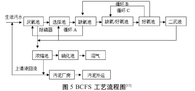 荷蘭Delft大學的Mark教授以氧化溝和UCT工藝為基礎(chǔ)研發(fā)的BCFS工藝是目前已投入使用的單污泥系統(tǒng)。該工藝主要由厭氧池、選擇池、缺氧池等5個主池及3個循環(huán)系統(tǒng)構(gòu)成,其工藝流程見圖5。