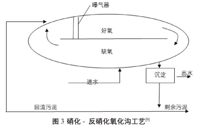 氧化溝工藝自問世以來在全世界范圍內(nèi)得到了廣泛應用,目前已成為我國污水處理的主導工藝之一。氧化溝具有獨特的構(gòu)造形式(如圖3),無終端循環(huán)水路,使得曝氣機產(chǎn)生的溶解氧沿著水流方向產(chǎn)生濃度梯度,并周而復始地發(fā)生變化,從而使得氧化溝在去除有機物的同時對混合液中的氮、磷也具有良好的去除效果。