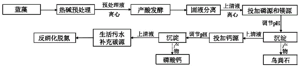 一種用于反硝化外加碳源的制備方法和應(yīng)用,具體涉及一種回收藍(lán)藻厭氧發(fā)酵液中氮磷后作為外加碳源的技術(shù),屬于固體有機(jī)廢物的處理與利用和水處理技術(shù)領(lǐng)域。